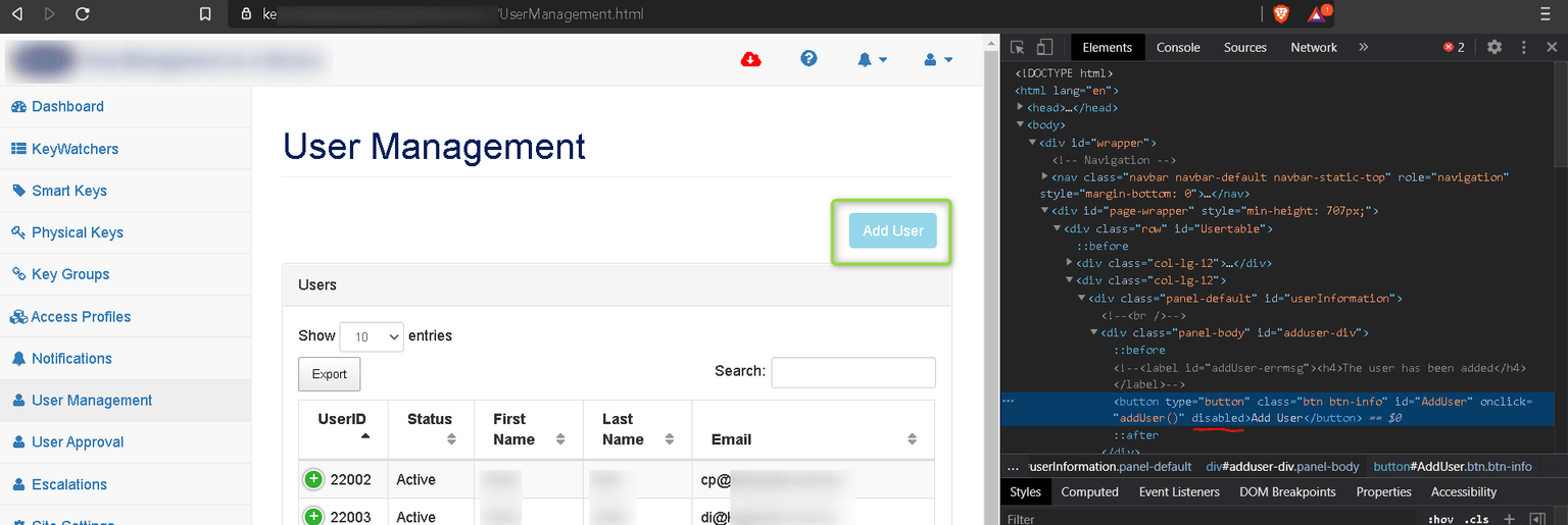 If you inspect the object and remove the “disabled” button’s attribute, the Add User form pops up: