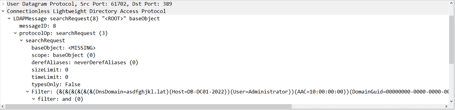 Finally, the target sends a searchRequest CLDAP packet to the attacker.